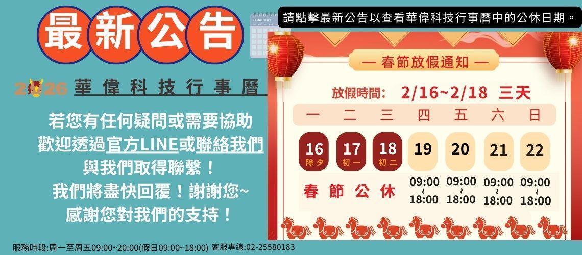 華偉科技即將在2026年2月4日(星期三)舉行尾牙聚餐! 2026年2月5日(星期四)早上9點至下午8點將正常提供維修安裝等服務。 |