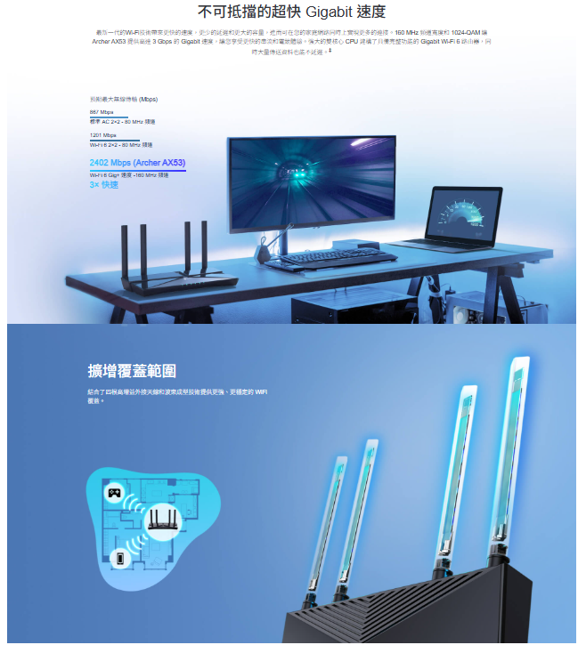 - 次世代 Gigabit Wi-Fi 6 速度—2402 Mbps(5 GHz) 和 574Mbps(2.4 GHz)頻段確保順暢的串流和快速的下載。
