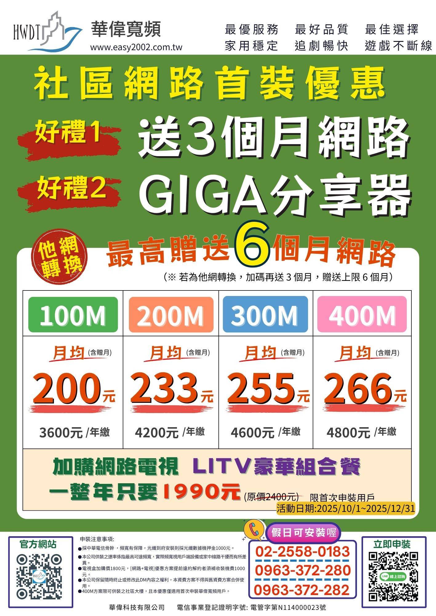 申購最高網速300M年繳4600元(會有專員主動聯繫),華偉科技有限公司